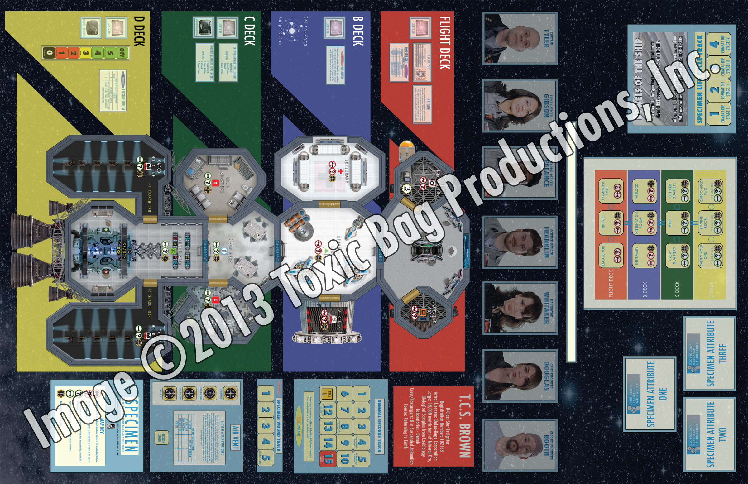 We’re getting closer and closer to having a finished Print and Play version of Specimen for you, and here’s the latest piece of the puzzle. This is the new layout for the game board, based on Steve’s original prototype and the ship design by John Eiberger.